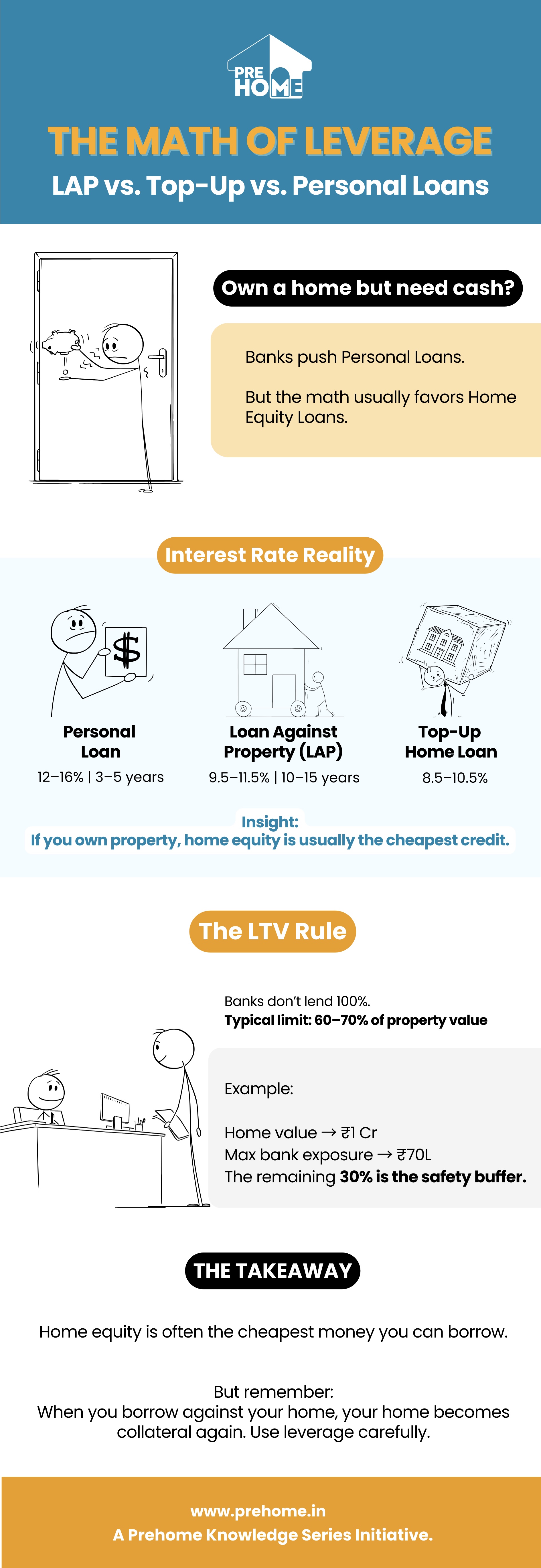• The Buffer : If your property is worth ₹1 Crore, the bank's maximum total exposure (existing loan plus new loan) is ₹70 Lakhs. This 30% buffer protects both you and the bank from sudden market drops.